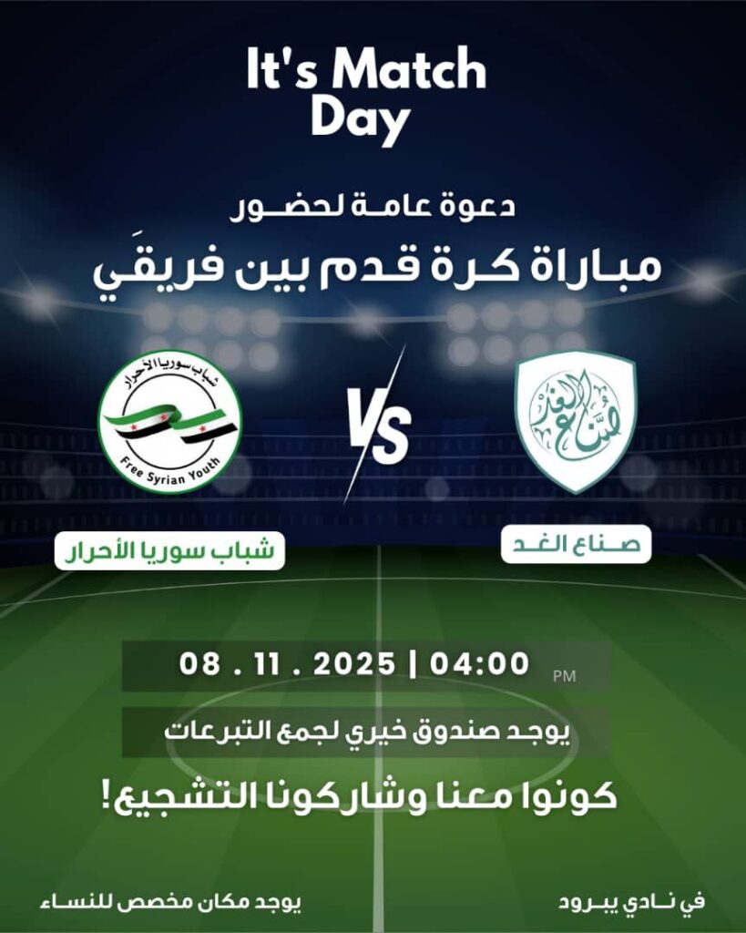 في أجواء مليئة بالحماس والروح الرياضية، اختُتمت المباراة الودّية بين فريق شباب سوريا الأحرار و فريق صناع الغد بنتيجة 8 – 4 لصالح شباب سوريا الأحرار 🎉👏