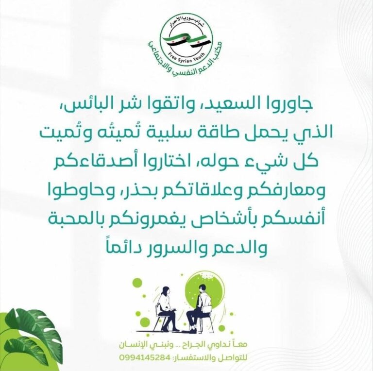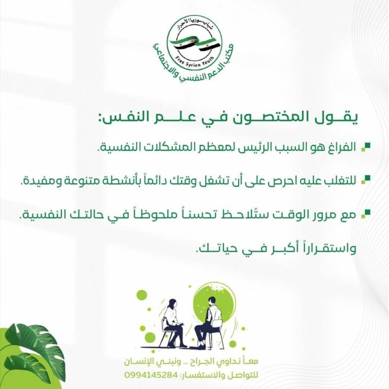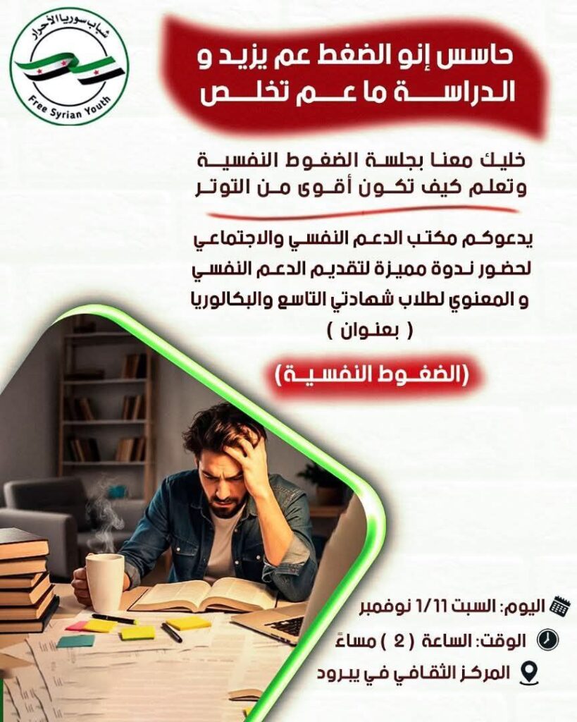 ~ يدعوكم مكتب الدعم النفسي والاجتماعي في مؤسسة شباب سوريا الأحرار لحضور ندوة مميزة لتقديم الدعم النفسي والمعنوي لطلاب شهادتي التاسع والبكالوريا بعنوان :
