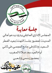 نتوجه إليكم بأسمى آيات التهاني والتبريكات بمناسبة عيد الأضحى المبارك، وهو أول عيد يمرّ علينا وقد نُكّست رايات الطغيان، وارتفعت رايات الحرية فوق أرض سوريا الحبيبة ..