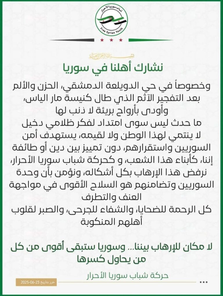 ما حدث ليس سوى امتداد لفكر ظلامي دخيل لا ينتمي لهذا الوطن ولا لقيمه، يستهدف أمن السوريين واستقرارهم، دون تمييز بين دين أو طائفة